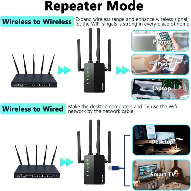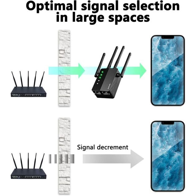 Avec des débits de données distincts de 300 Mbps à 2,4 GHz et 867 Mbps à 5 GHz, le répéteur garantit une transmission rapide et stable sur les deux bandes, adaptée à diverses activités en ligne.