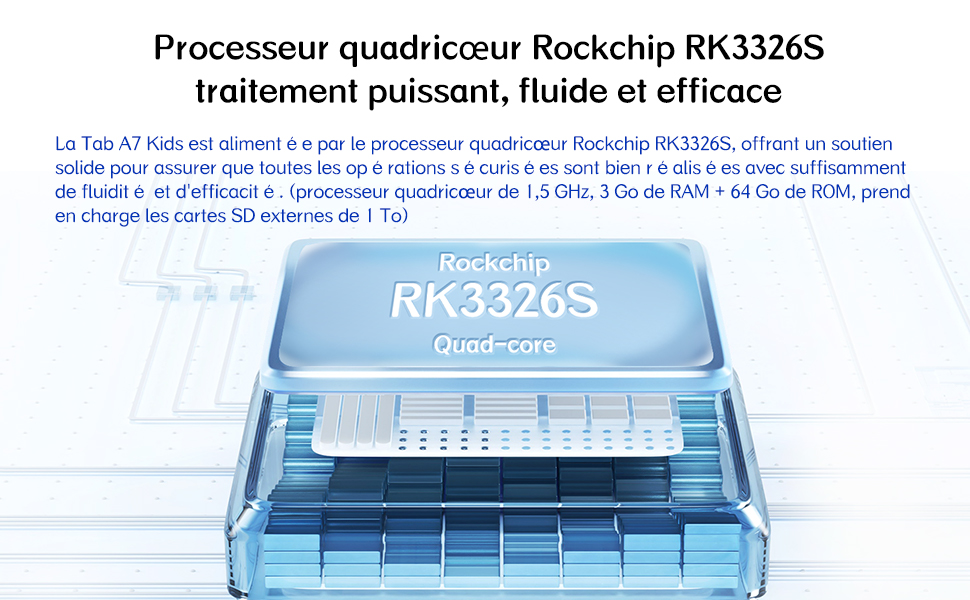 Équipée d’un processeur Rockchip RK3326S quadricœur et d’un GPU Mali-G31MP2, cette tablette assure fluidité et rapidité dans les jeux et les applications éducatives. Avec 3 Go de RAM extensibles à +2 Go et 64 Go de stockage interne extensible jusqu’à 1 To, vos enfants auront tout l’espace nécessaire pour apprendre et s’amuser.